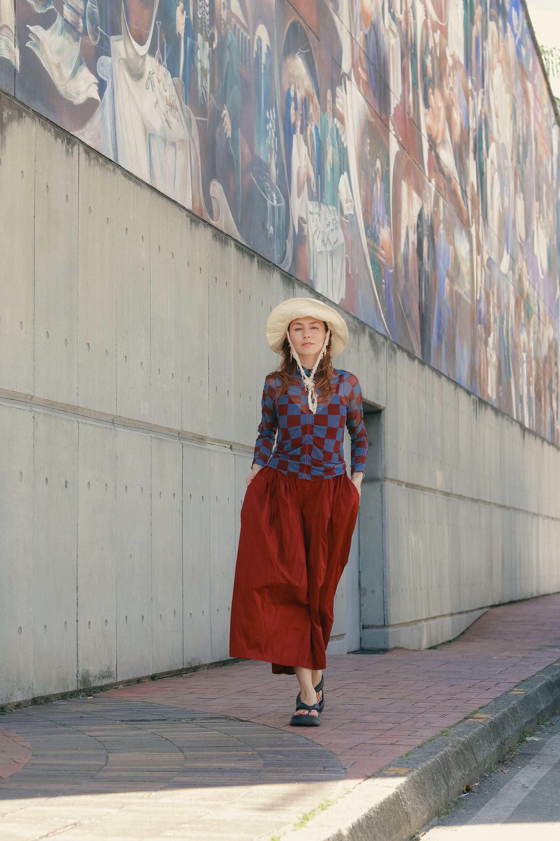 Top mesh cuadros azul y vino. Transparente, atrevido, listo para layering o llevar solo.