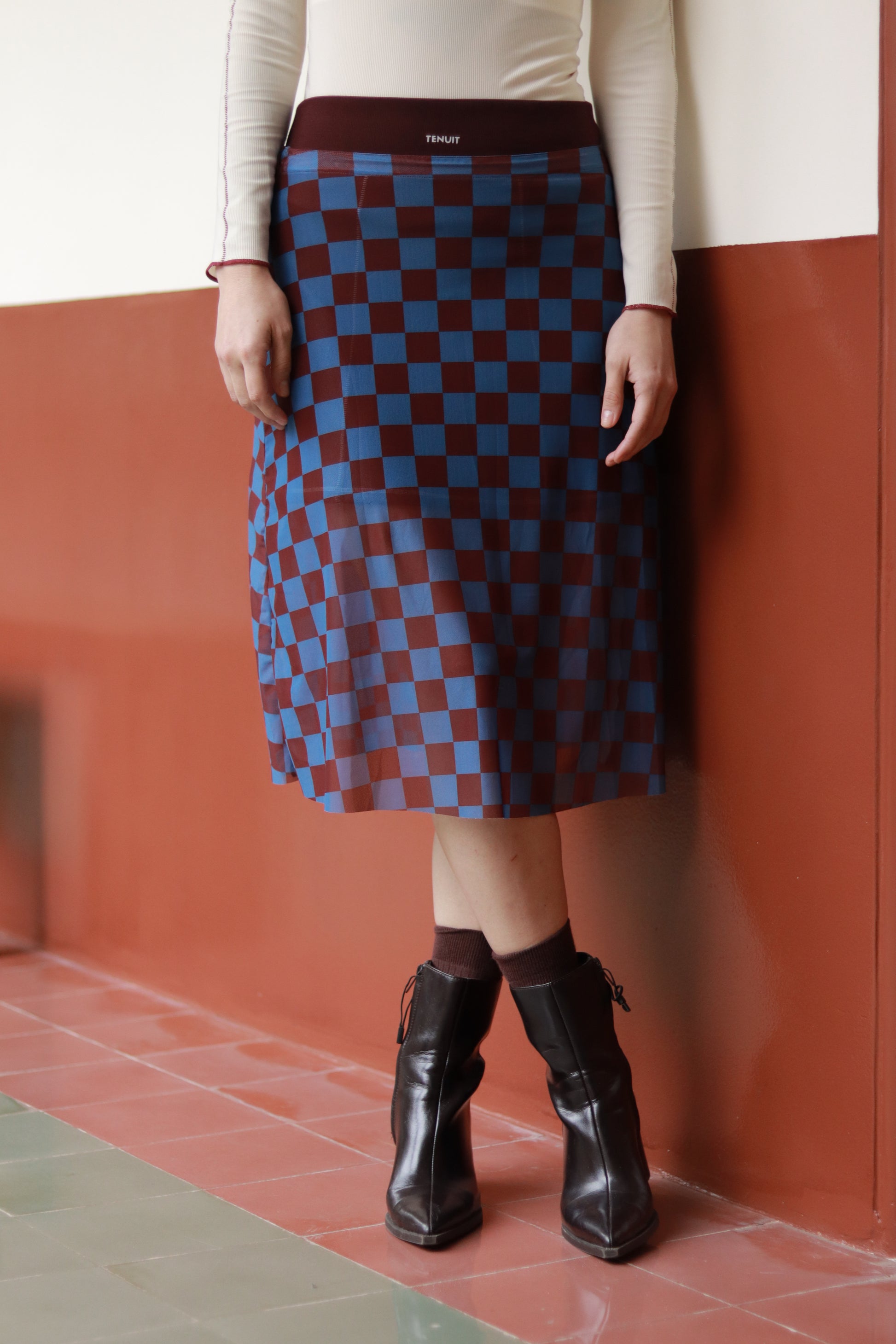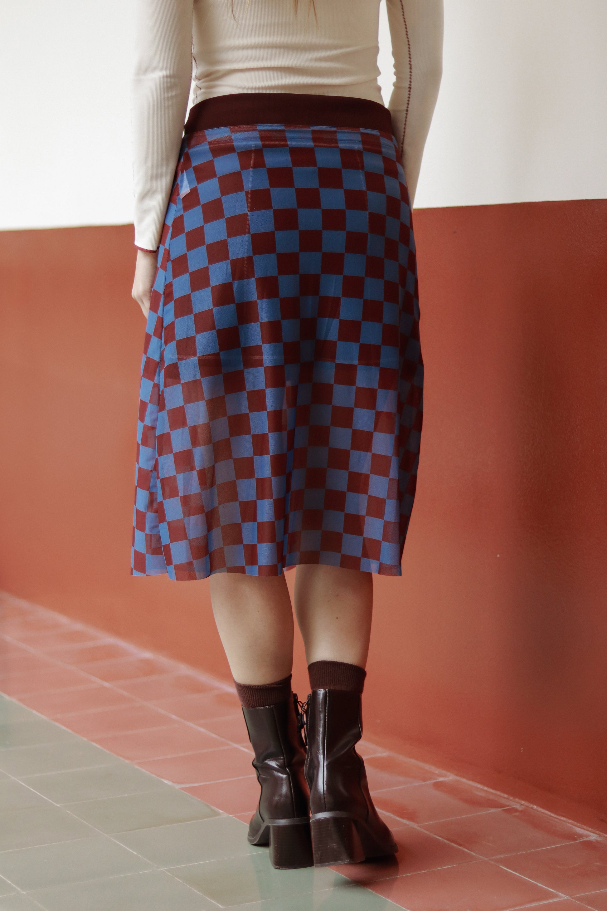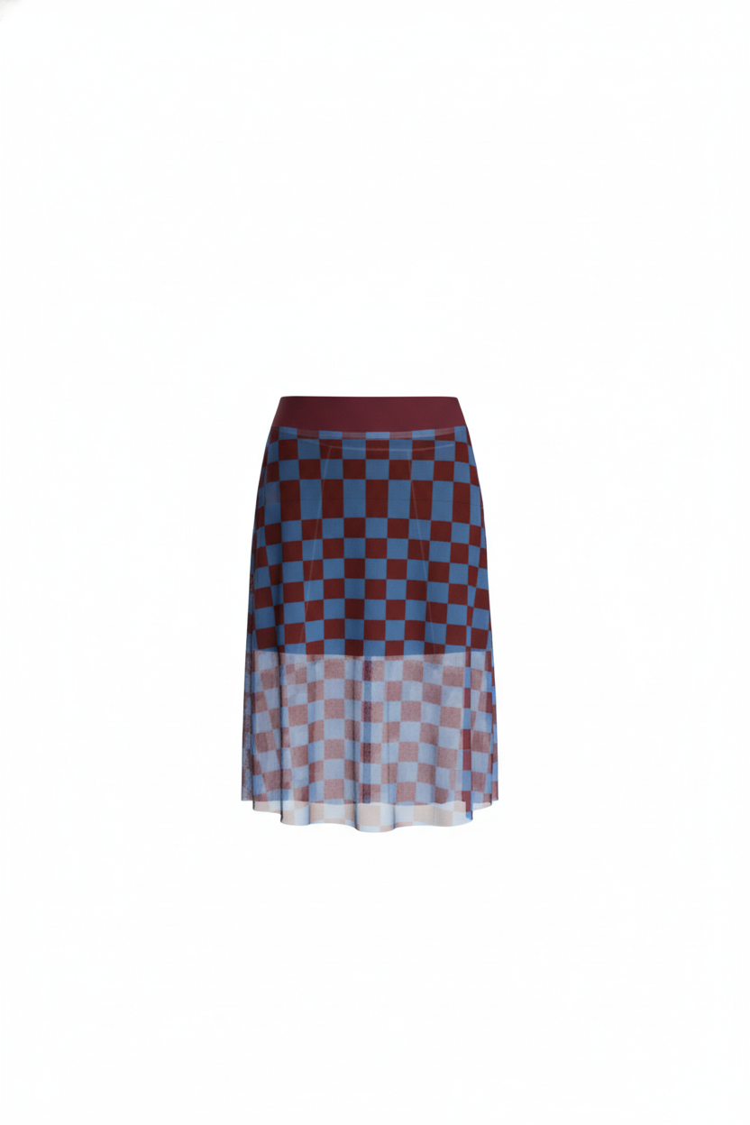 La Slow Queen es una falda larga en mesh de cuadros azul con vino tinto, pensada para moverse contigo en cualquier dirección. Su ligereza y fluidez hacen que cada paso se sienta estratégico y, al mismo tiempo, libre.