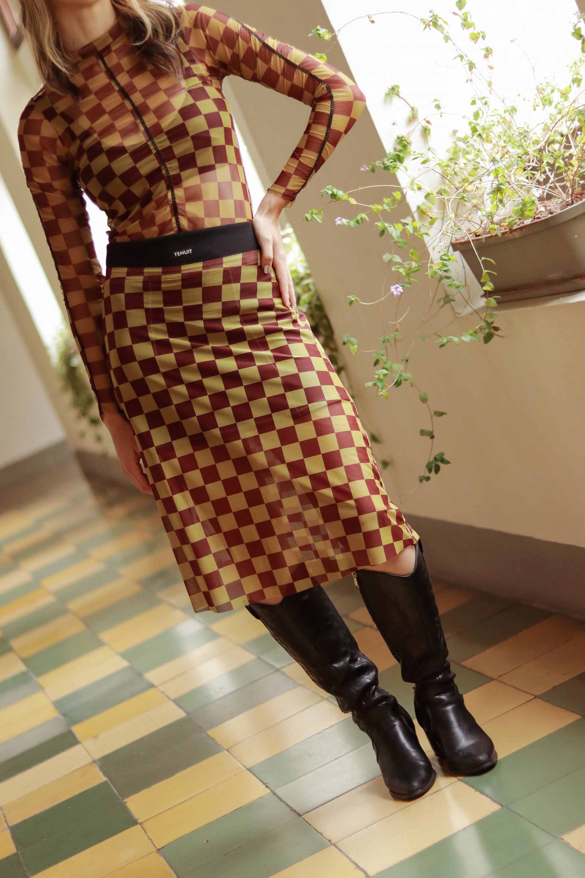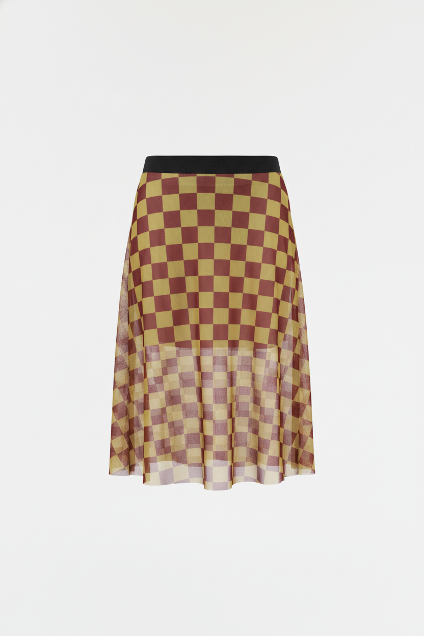 La Slow Queen es una falda larga en mesh de cuadros mostaza con vino tinto, pensada para moverse contigo en cualquier dirección. Su ligereza y fluidez hacen que cada paso se sienta estratégico y, al mismo tiempo, libre.