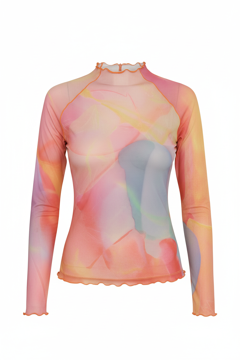 Buzo semitransparente con estampado efecto mármol en tonos cálidos. Su ajuste ceñido y su diseño de mangas largas lo hacen perfecto para un look fresco y versátil.